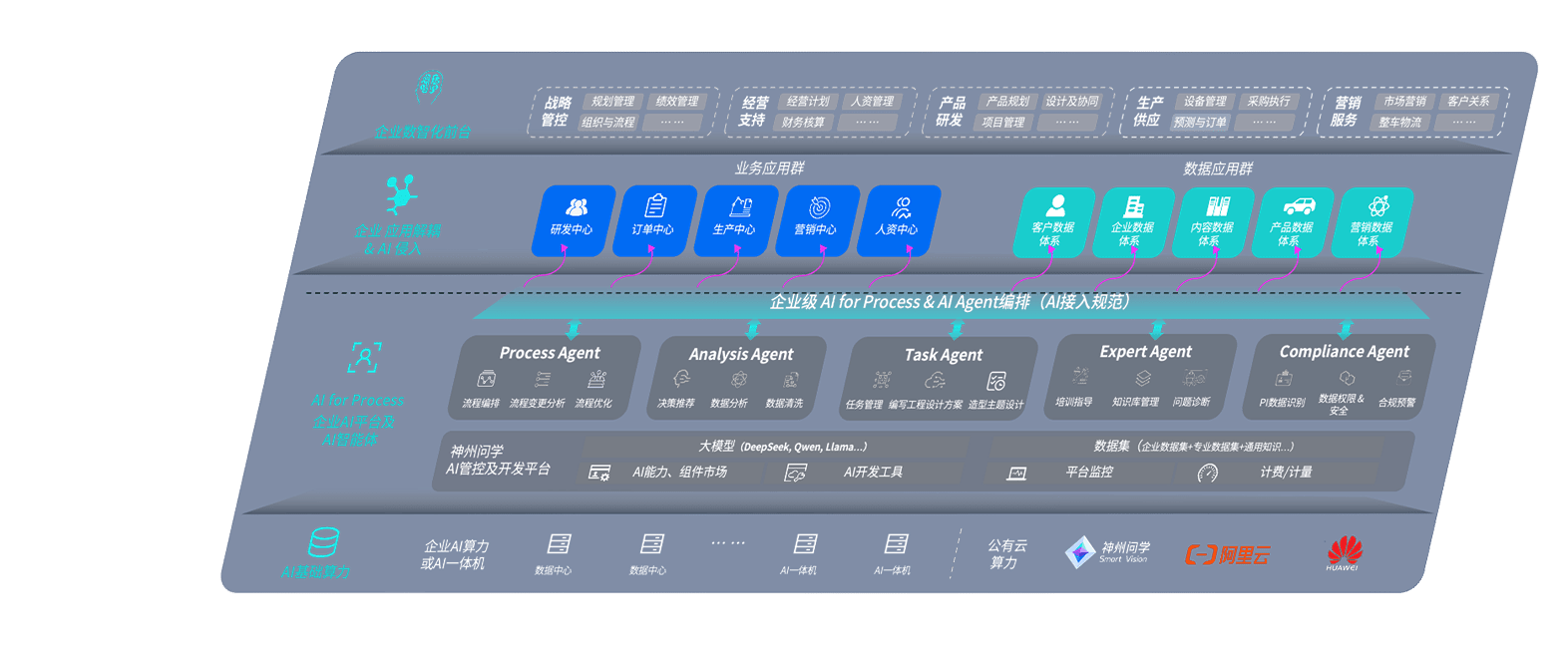 端到端的一站式AI工作空间深度融合了从企业战略规划到日常经营的全流程业务板块,,定向解决车企内部领域多、、、、部门多、、、、链条长、、、场景碎片化等难题,,,,支持车企快速构建以AI为核心的生产力写作体系,,实现任务执行与AI能力的无缝集成与交互