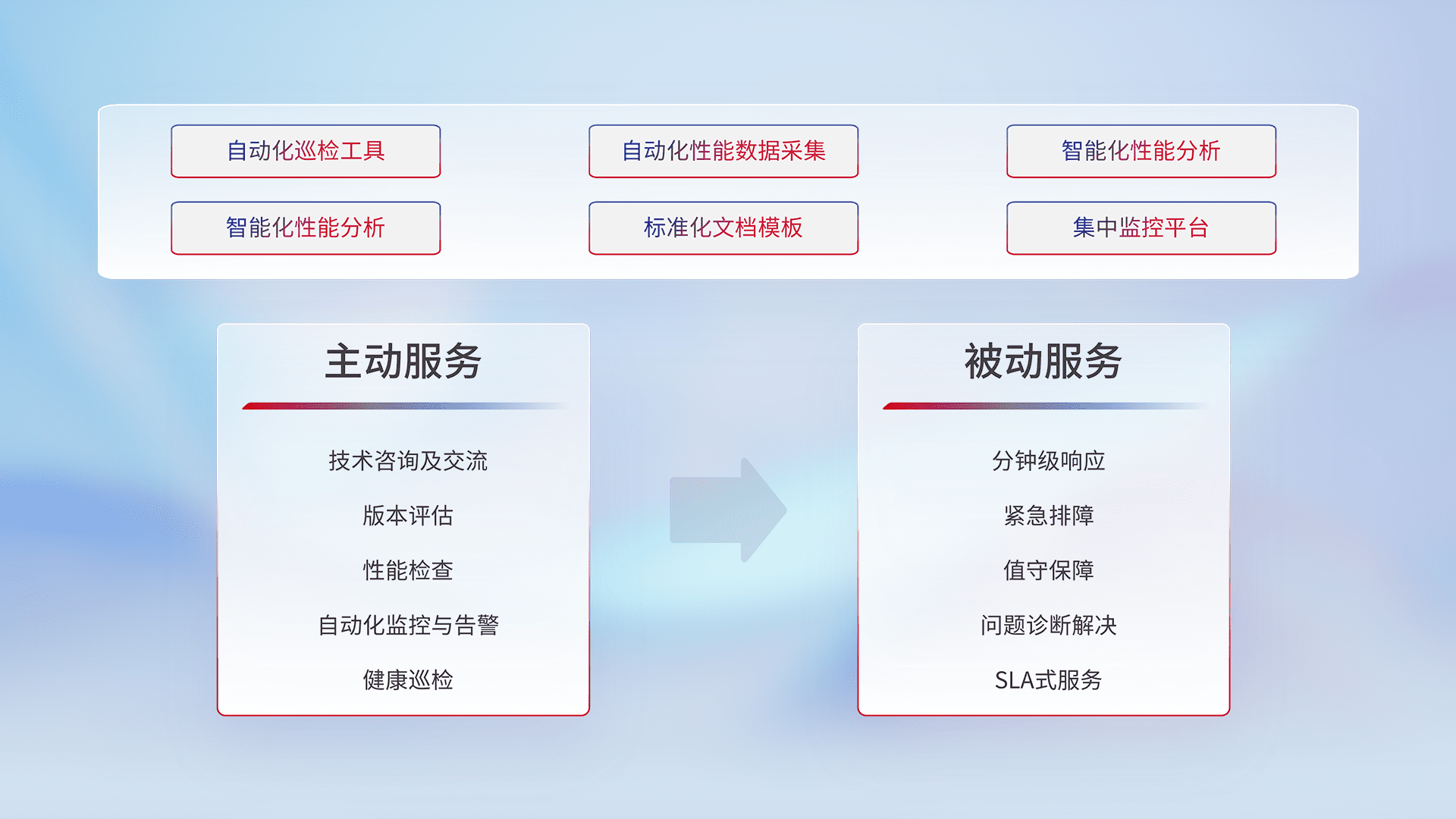 智能化工具和标准化文档,,保障服务质量,,提供主动服务(包含技术咨询、、、版本评估、、性能检查、、、、自动化监控与告警、、、健康巡检)和被动服务包含(分钟级响应、、、、紧急排障、、、值守保障、、、、问题诊断解决、、、、SLA服务)。。